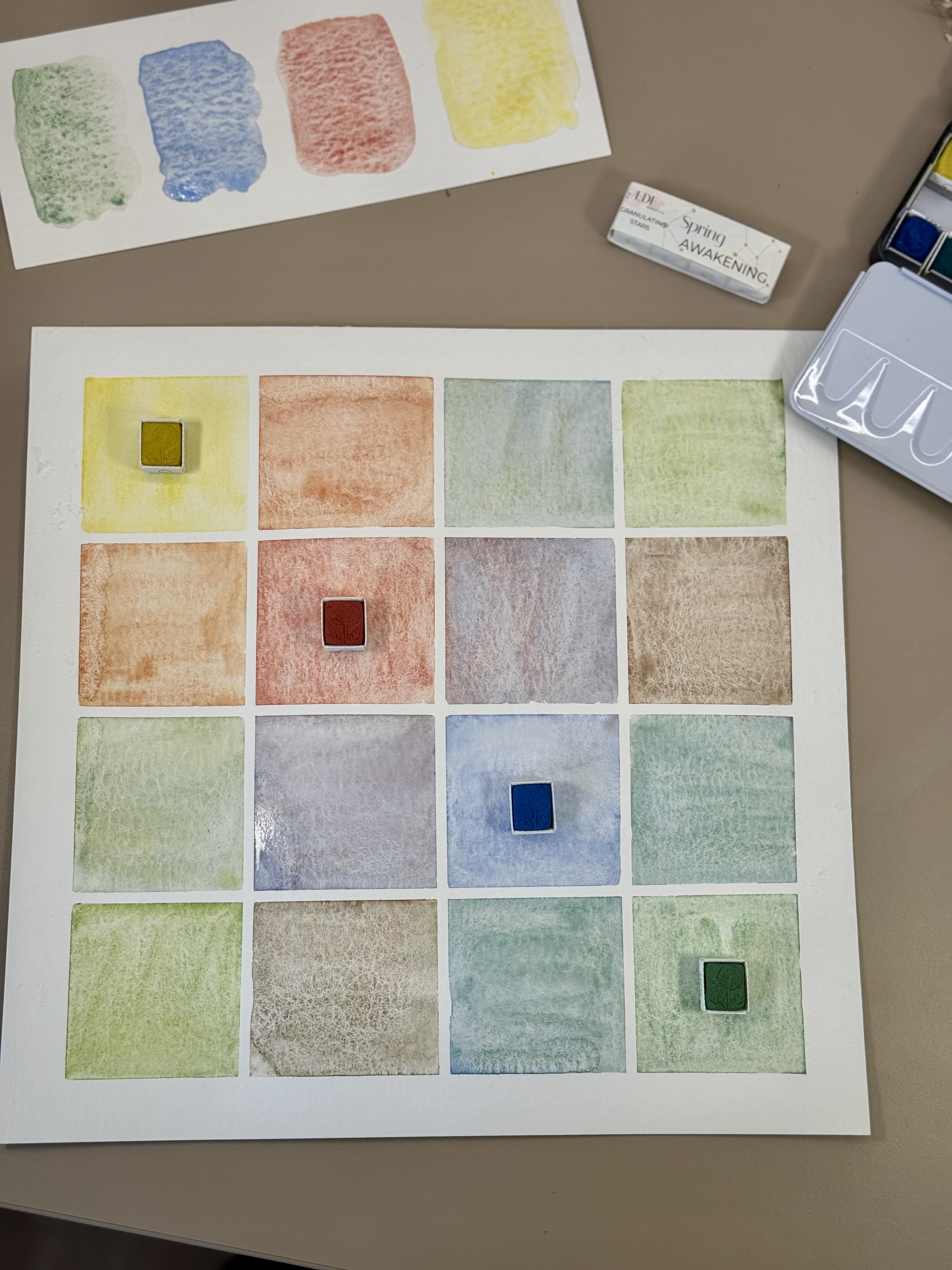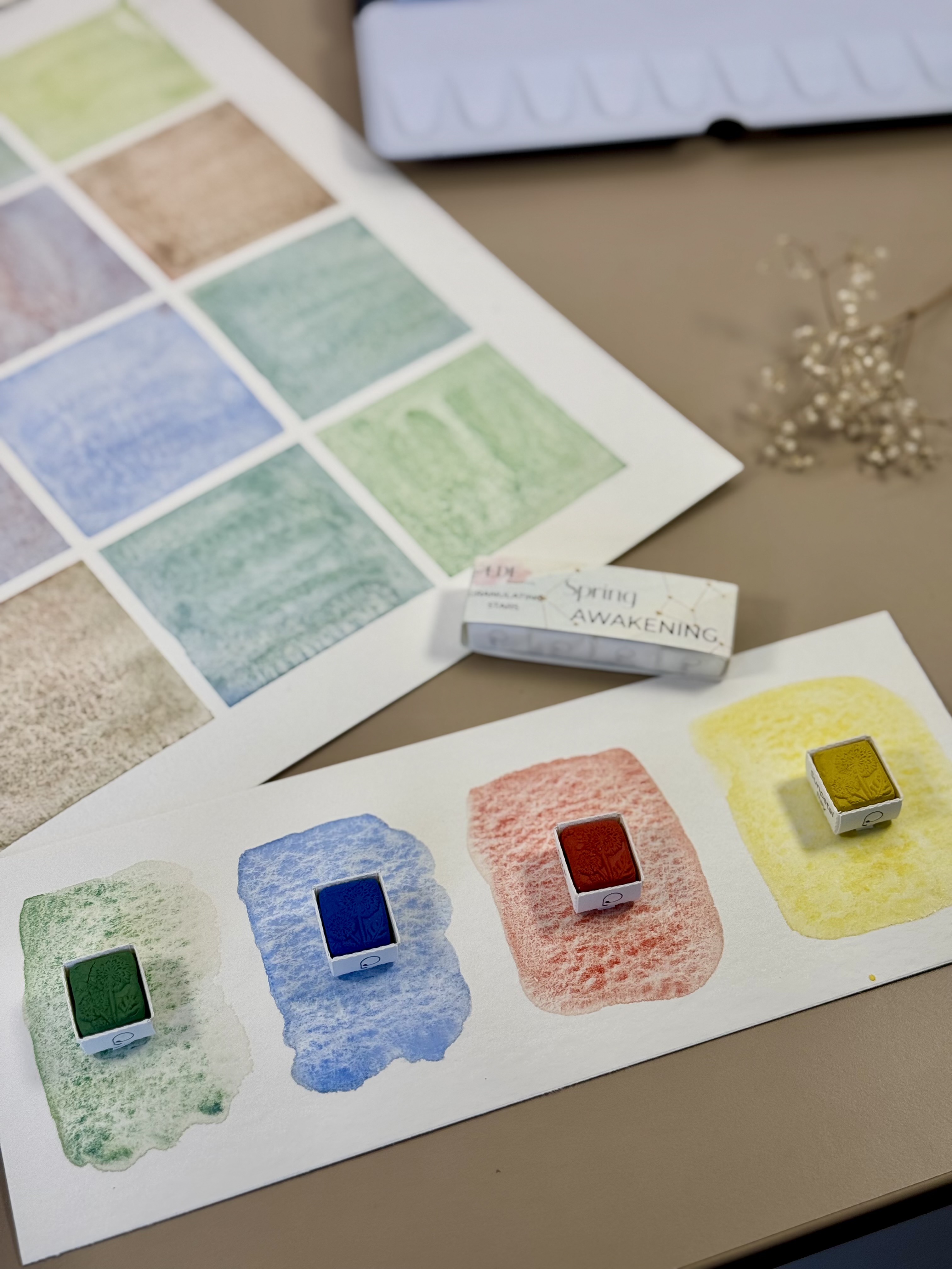 Vier außergewöhnliche Aquarellfarben mit starker Granulation und frühlingshaften Nuancen. Ein Set für lebendige Hintergründe, Blütenmotive und erwachende Kunstwerke voller Energie.
