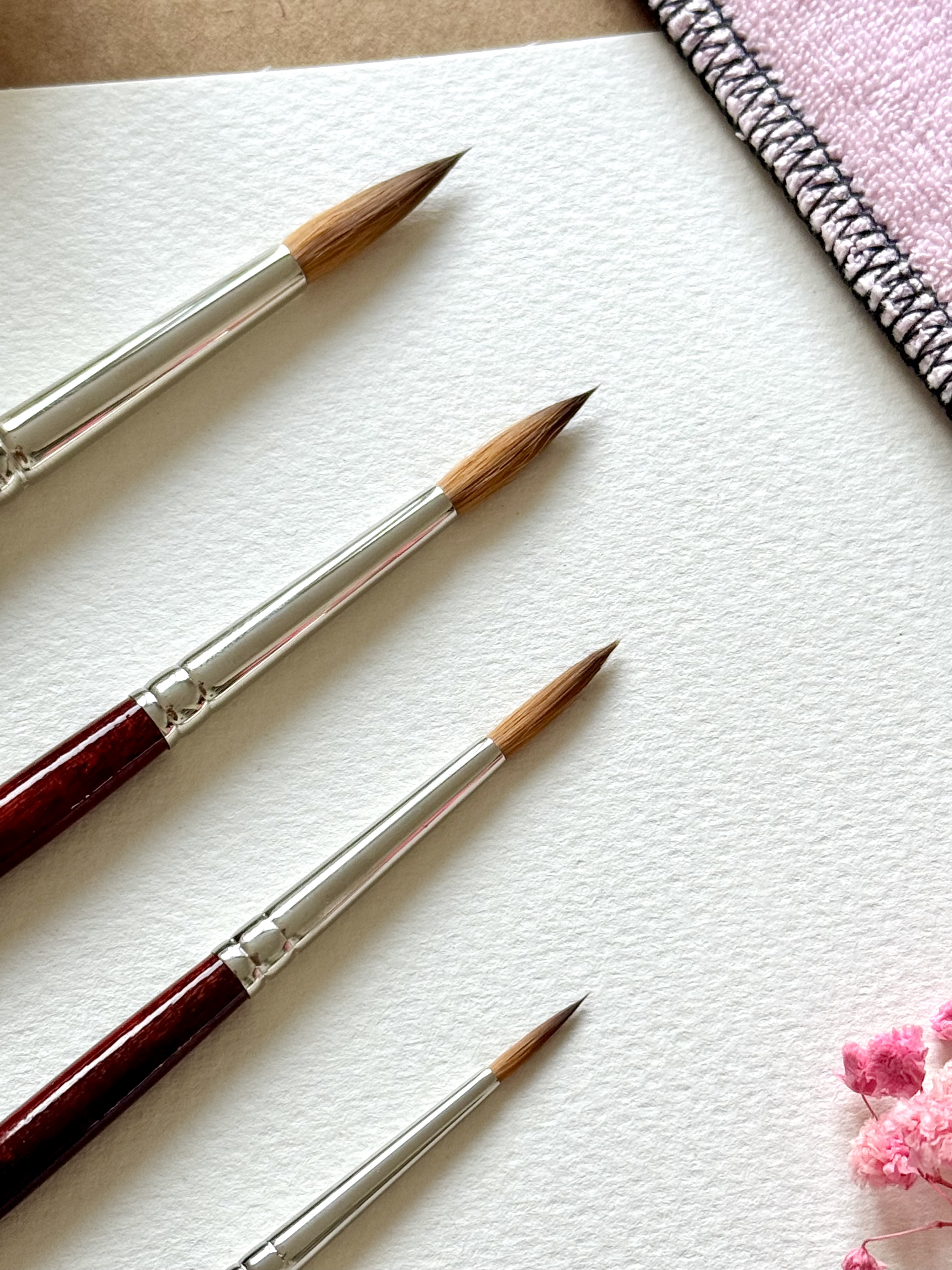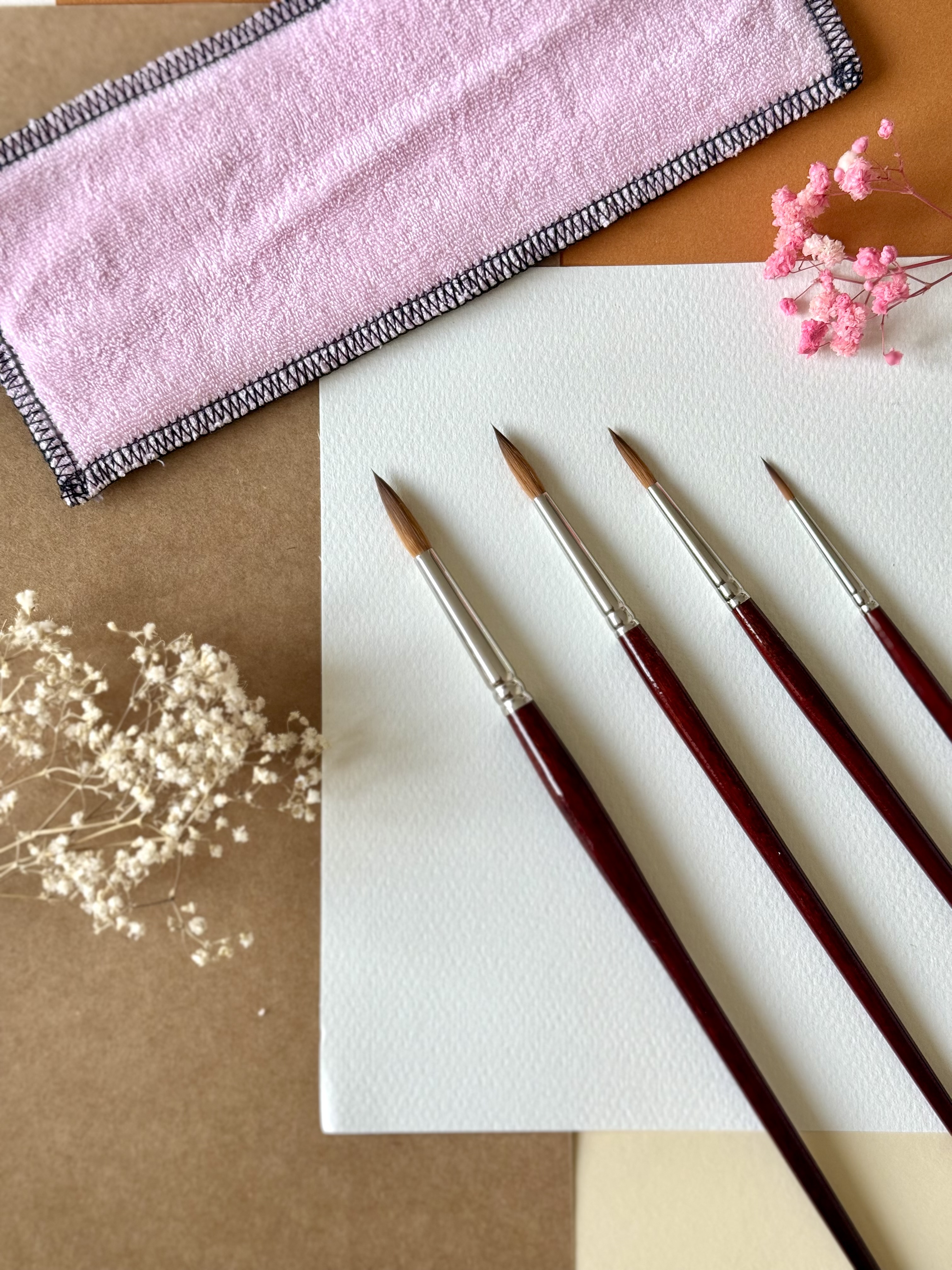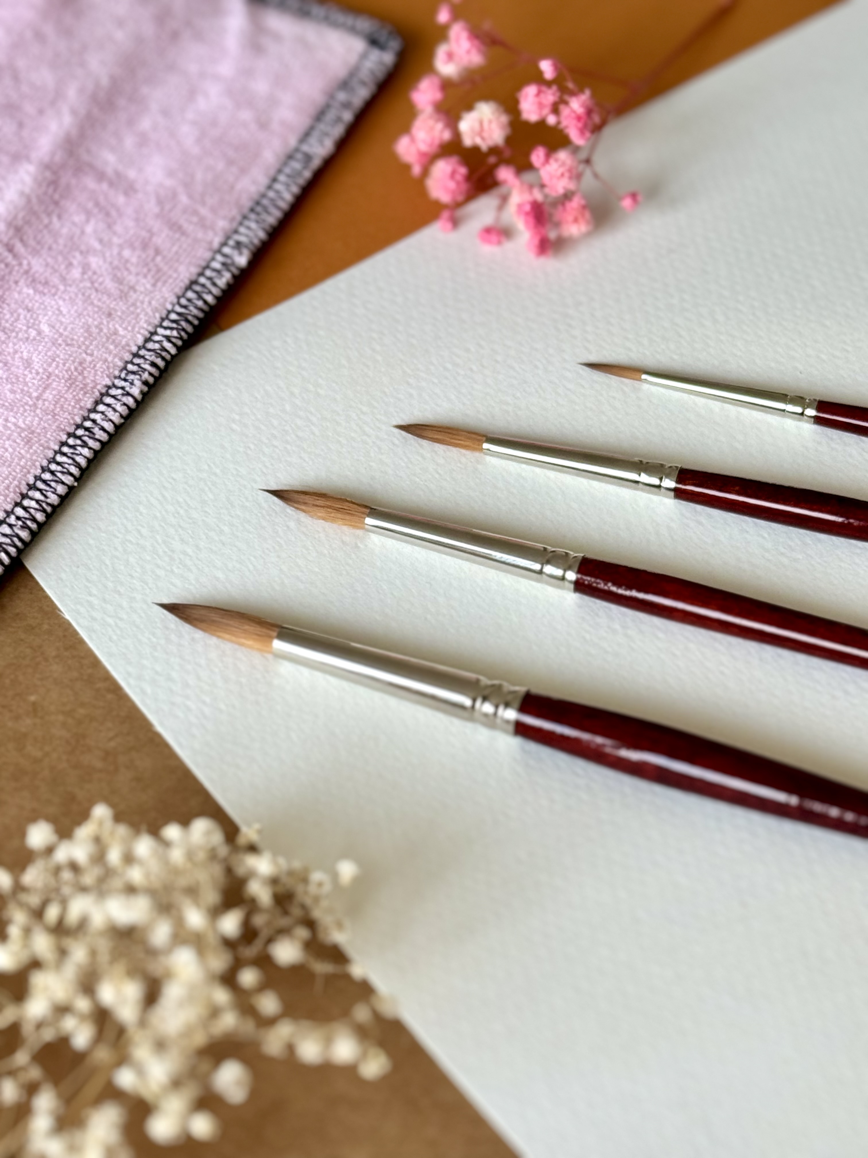 Vier hochwertige Synthetikpinsel aus deutscher Manufaktur mit eleganten Mahagoni-Stielen. Dazu ein luxuriöses 4-lagiges Pinseltuch – alles, was du brauchst für deine Aquarelle.