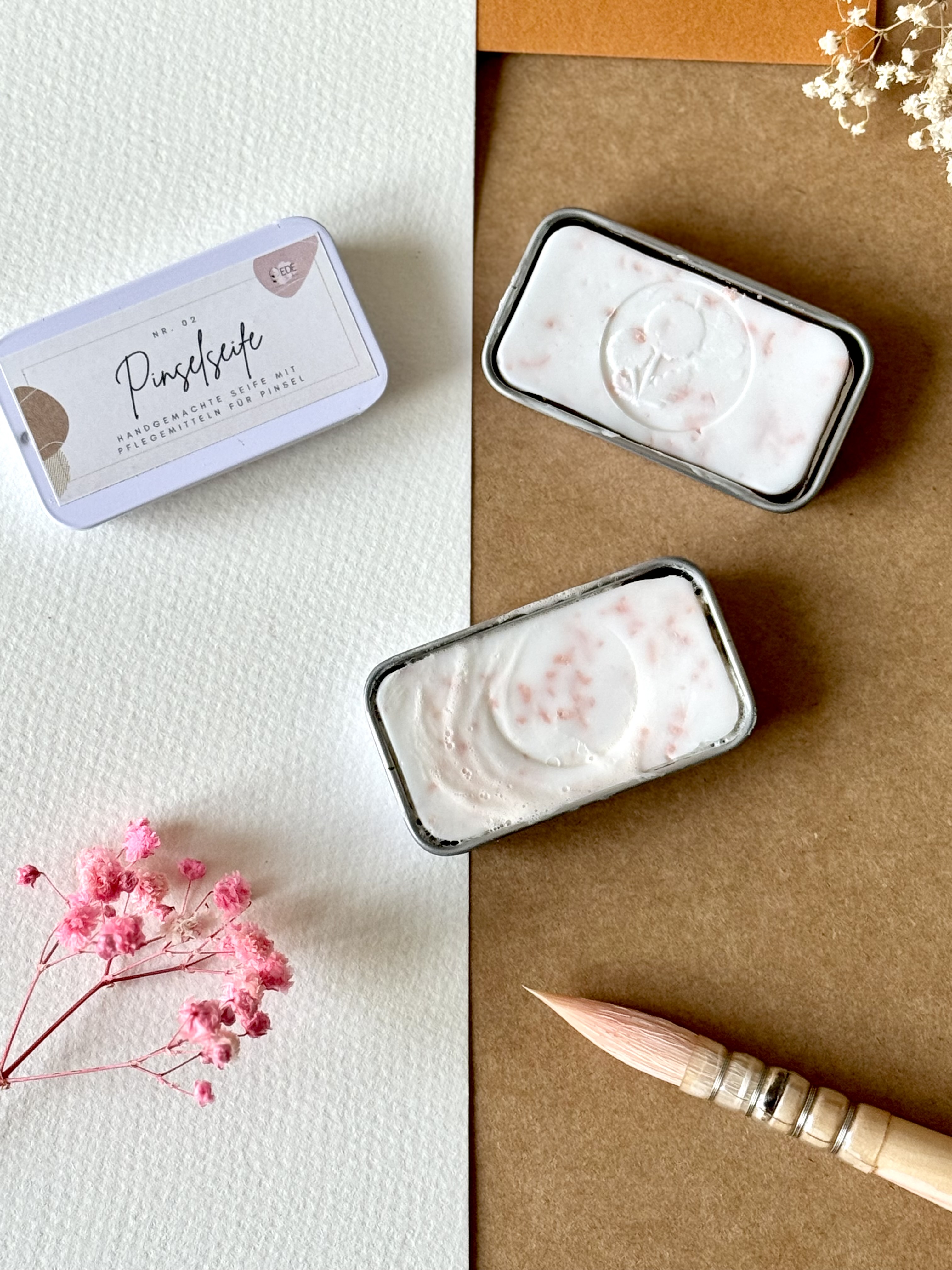 1 handgemachtes Pinselseifchen in einer stabilen, wiederverwendbaren Metalldose. Perfekt zum Aufbewahren und zum Verschenken.
