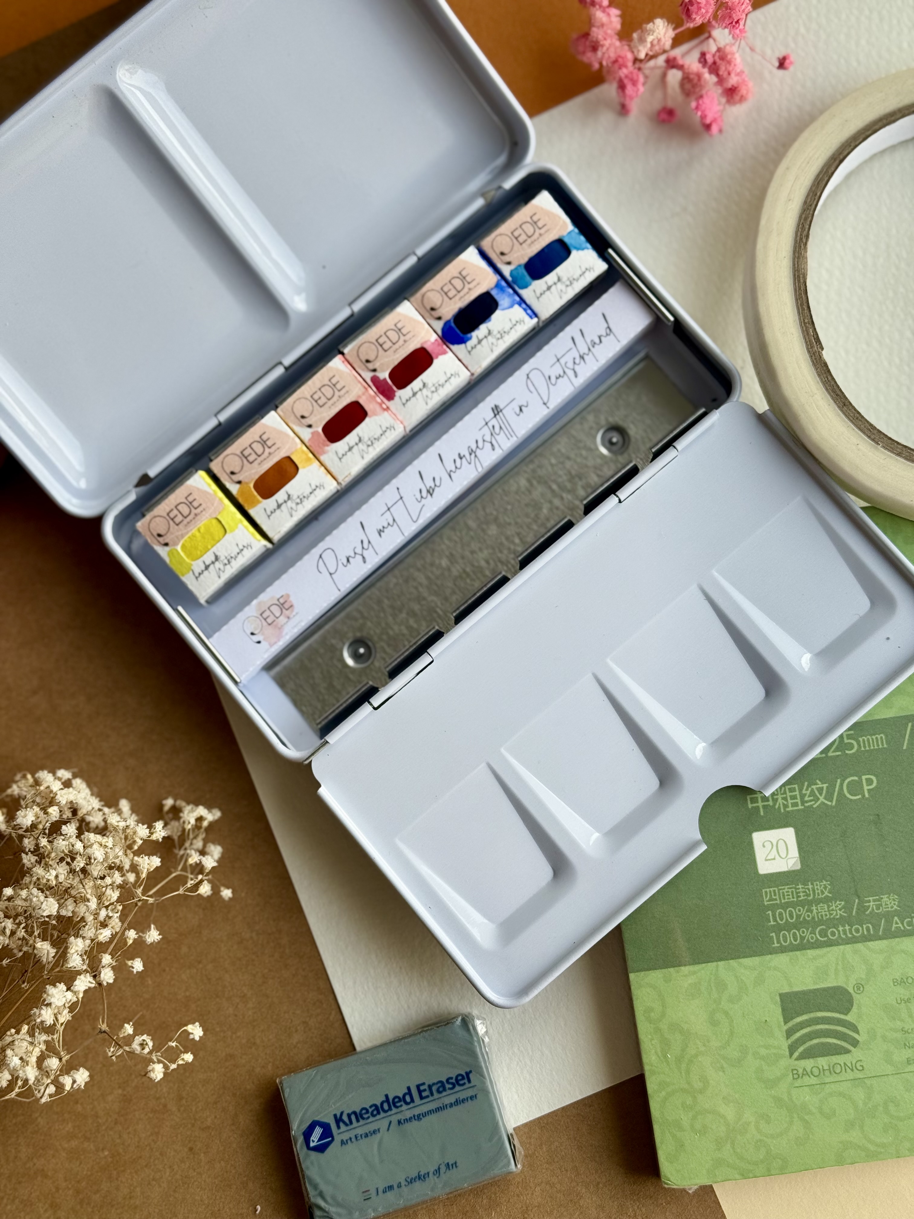 Alles, was du brauchst, um sofort zu starten. Ein komplettes Set mit hochwertigen Materialien und 6 handgemachten Aquarellfarben aus der Split-Palette – perfekt für Anfänger.