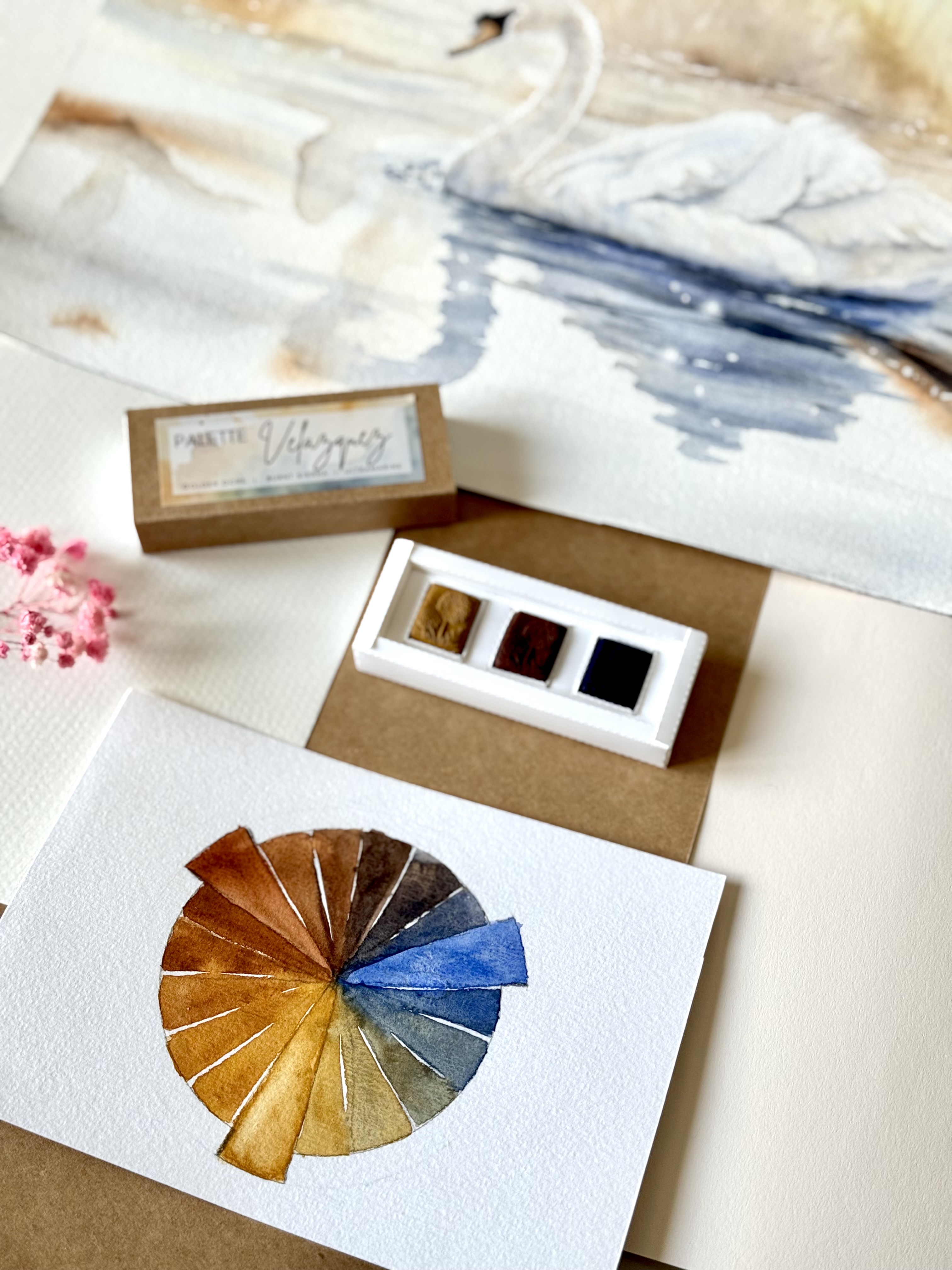 Drei hochwertige, handgemachte Aquarellfarben in stabilen, handgeformten Papiernäpfchen mit Farbstempel und Beschriftung. Liebevoll verpackt als Premium-Set mit Banderole.